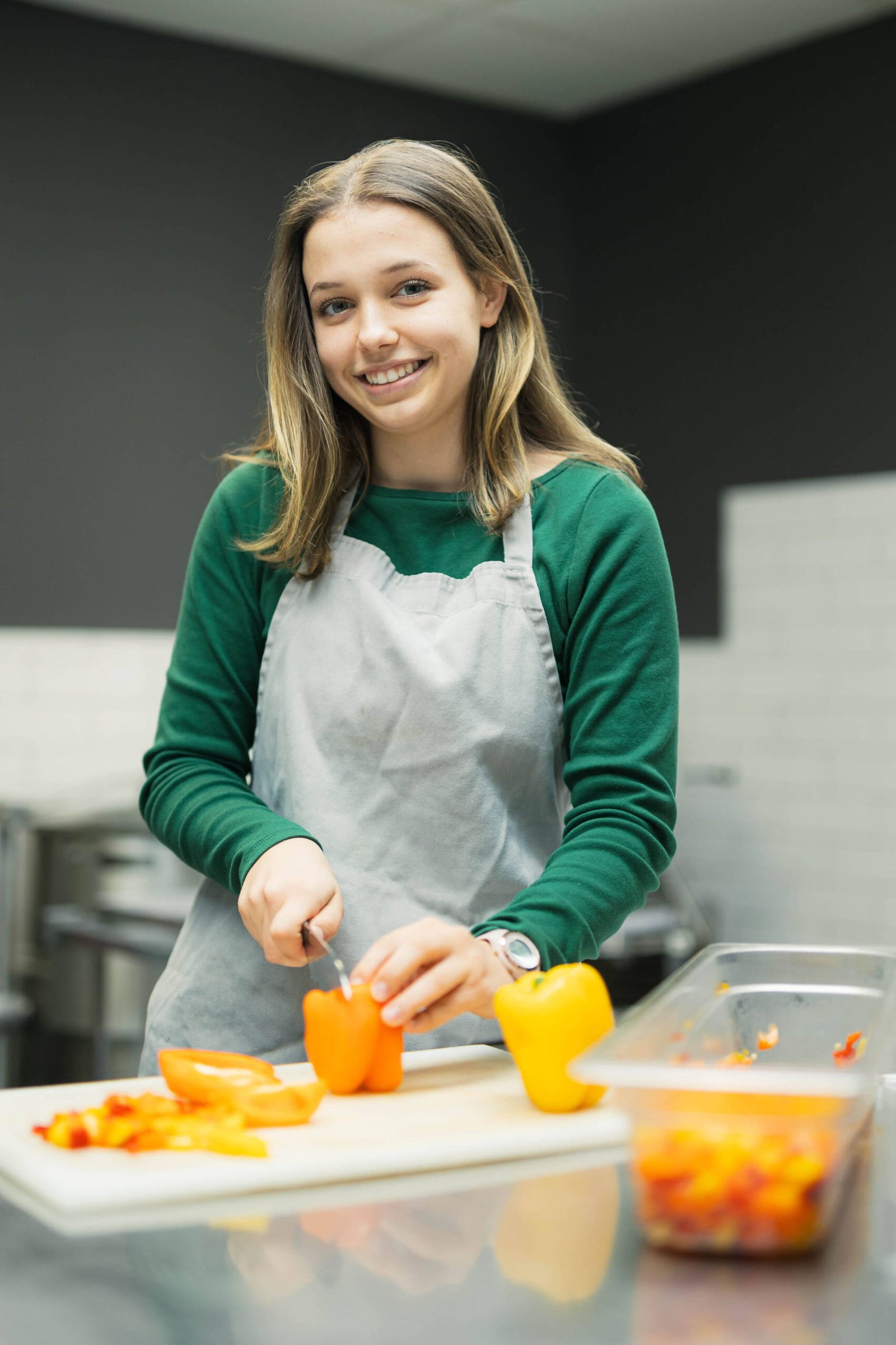 “I like to work in the cafeteria because it teaches a variety of skills. Not only do I get to make delicious food for a lot of people, but I’ve also learned how to work with a team so that the work shift runs efficiently. I’ve also learned how to make vegan food taste good!”